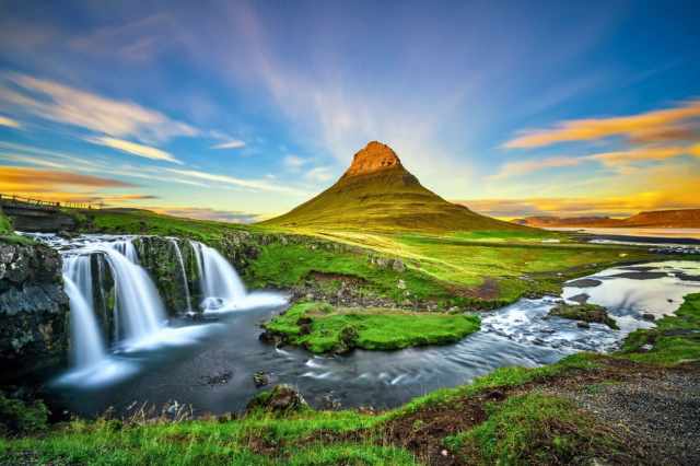 Iceland’s Kirkjufell Mountain and waterfall at sunset.